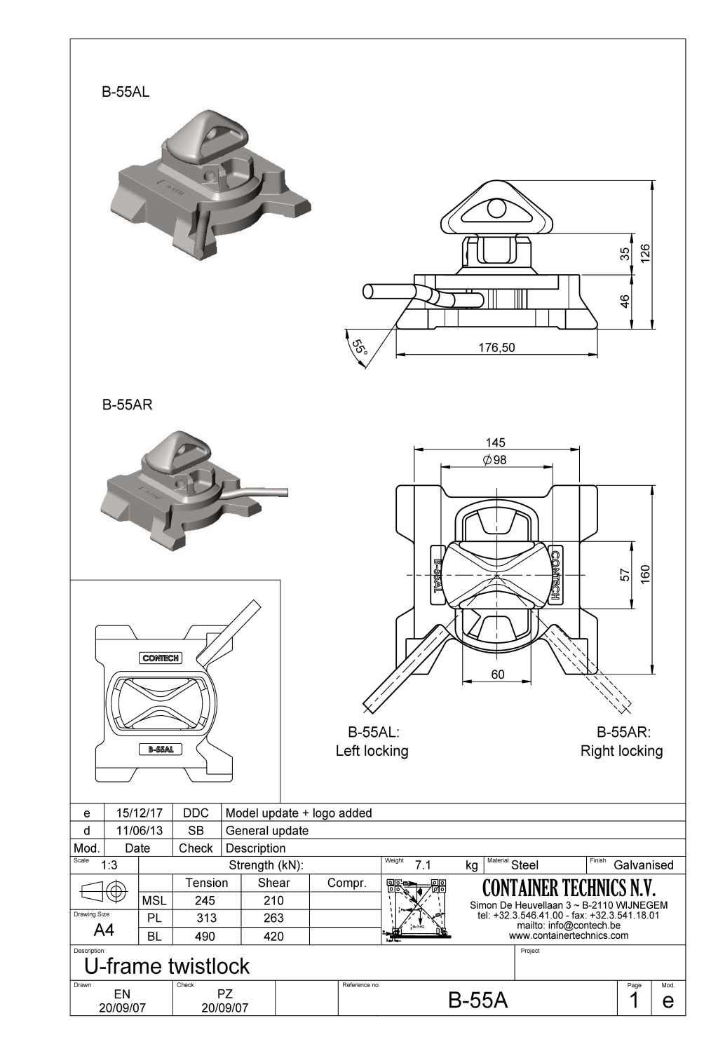 The CONTECH® dovetail or U-frame twistlock B-55A is a bottom twistlock used in combination with a dovetail or U-frame FR-34, Fr-34BQ (elongated) or a double FR-35B/A of 55 degrees to secure the corner castings of containers on board of a vessel.The B-55A has reduced wings to decrease to make it easier and faster to remove it from the dovetail or U-frame.