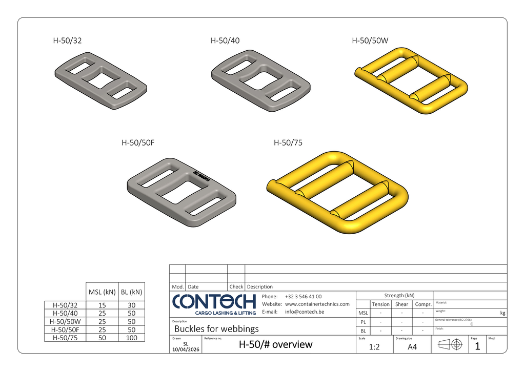 The H-50 range is available in different buckle sizes, optimised for various webbing widths and load requirements, as shown in the technical drawing. Depending on the selected variant, the buckles offer different Maximum Securing Loads (MSL) and Breaking Loads (BL), allowing correct matching to the lashing system and cargo weight.